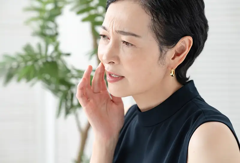 30から50代の⼥性に多い、頬⾻のあたりやこめかみや⼝元などに左右対称性に現れる薄褐⾊のシミです。